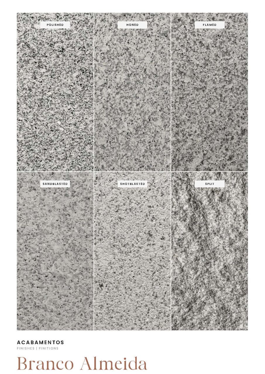 Available in the following finishes: Polished, Honed, Brushed, Flamed, Flamed+Brushed, Tumbled, Bastide and Sandblasted.