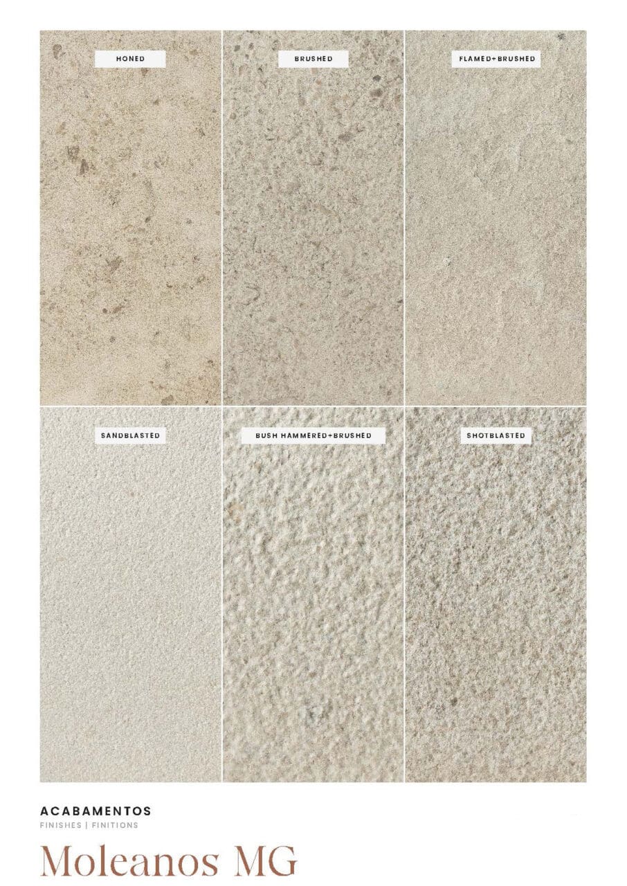 Available in the following finishes: Polished, Honed, Brushed, Flamed, Flamed+Brushed, Tumbled, Bastide and Sandblasted.