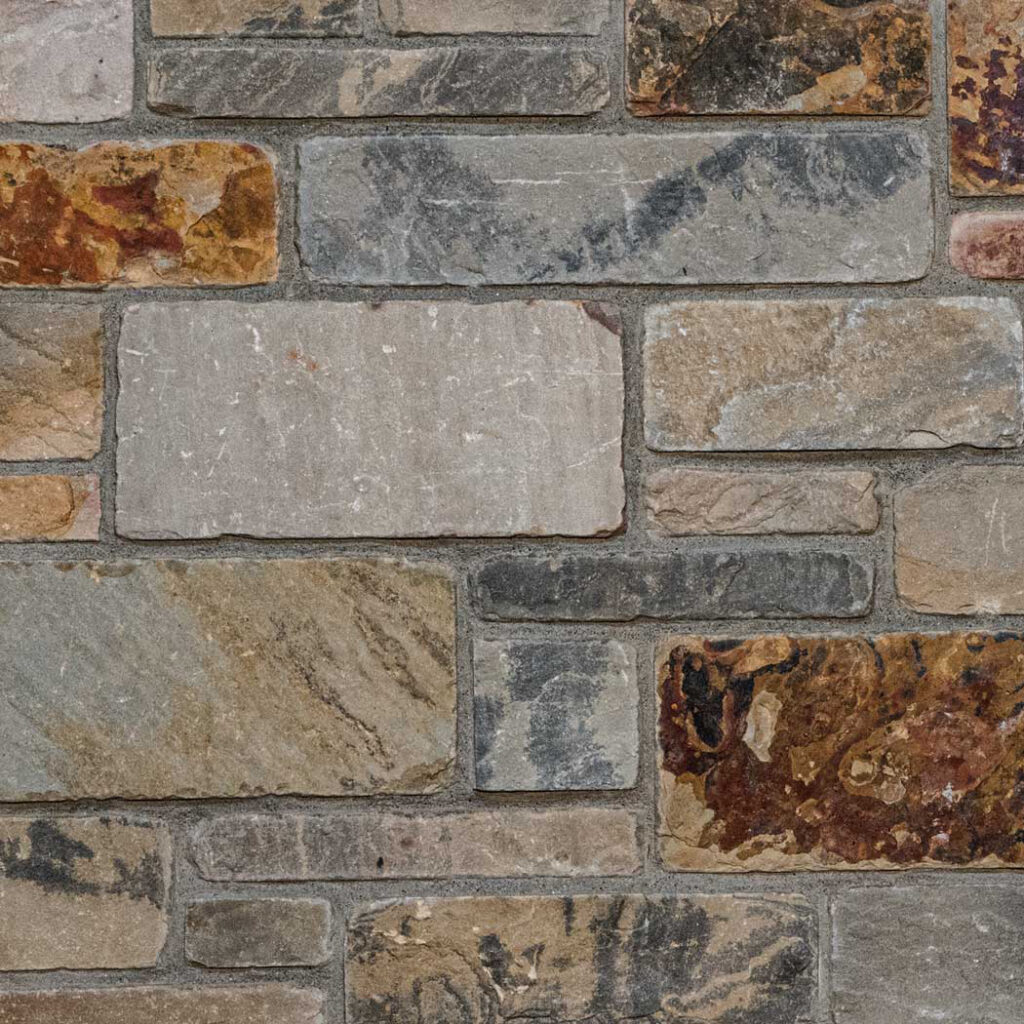The Saddleback 3 Course Ashlar Thin Veneer features a thoughtfully arranged composition of stones, meticulously stacked in three distinct courses. Each stone boasts a rich palette of earthy tones, ranging from warm browns and deep russets to subtle hints of gray.